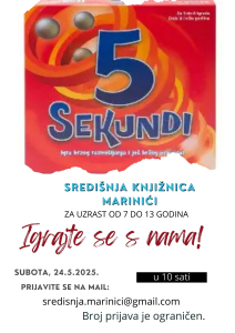 Djeco, pozivamo vas u subotu 24. svibnja u Središnju knjižnicu Marinići, u 10 sati, da zaigrate društvenu igru “5 sekundi” i podružite se. Prijaviti se možete na e-mail: sredisnja.marinici@gmail. Igra je namijenjena za uzrast od 7 do 13 godina. Broj prijava je ograničen.