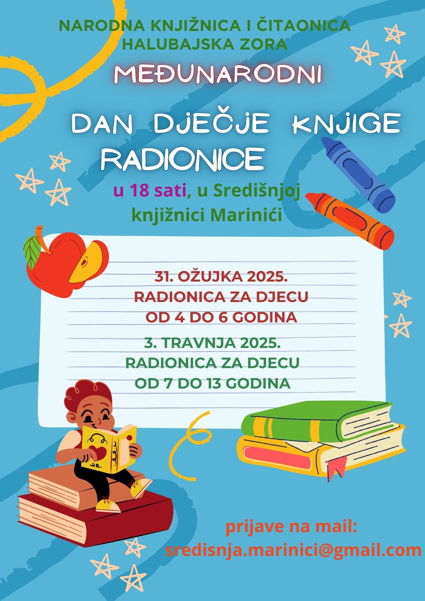 U povodu Međunarodnog dana dječje knjige koji se svake godine obilježava 2. travnja, a kojim se želi ukazati na važnost dječje knjige i ljubavi prema čitanju, u Središnjoj knjižnici u Marinićima realizirane su dvije radionice: