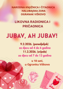 Pozivamo vas da nam se pridružite u likovnim radionicama i pričaonicama za djecu u povodu Valentinova. Likovne radionice i pričaonice će se održati u Ogranku Viškovo. Broj sudionika je ograničen. U ponedjeljak 9.2. održat će se radionica za djecu od 4 do 6 godina, a u srijedu 11.2. radionica za djecu od 7 do 13 godina, s početkom u 18 sati. Prijaviti se možete putem e-maila: sredisnja.marinici@gmail.com, ogranak.viskovo@gmail.com, putem viber grupa i osobno u knjižnici. Djeco, očekujemo vas.